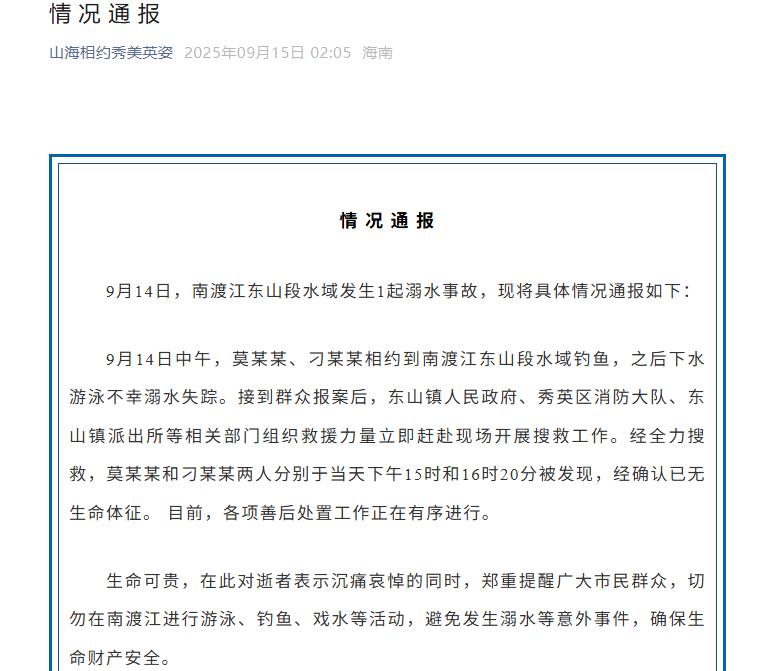 中国网9月15日讯海口秀英区东山镇人民政府通报,9月14日,南渡江东山段水域发生1起溺水事故。9月14日中午,莫某某、刁某某相约到南渡江东山段水域钓鱼,之后下水游泳不幸溺水失踪。接到群众报案后,东山镇人民政府、秀英区消防大队、东山镇派出所等相关部门组织救援力量立即赶赴现场开展搜救工作。经全力搜救,莫某某和刁某某两人分别于当天下午15时和16时20分被发现,经确认已无生命体征。 目前,各项善后处置工作正在有序进行。