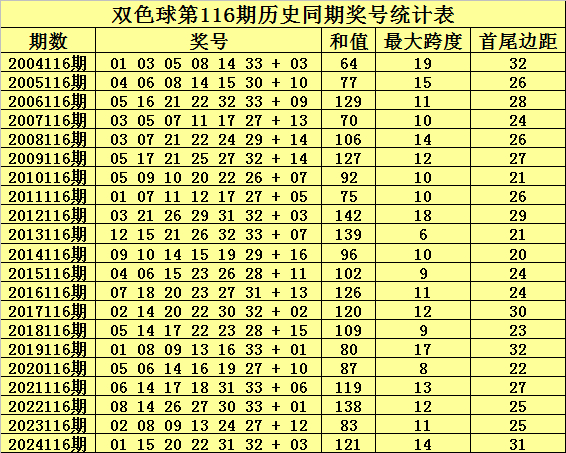 最大跨度推荐:在第116期历史同期开奖中,红球最大跨度全部在6-19之间开出,今年同期注意低位最大跨度出现,参考最大跨度6。