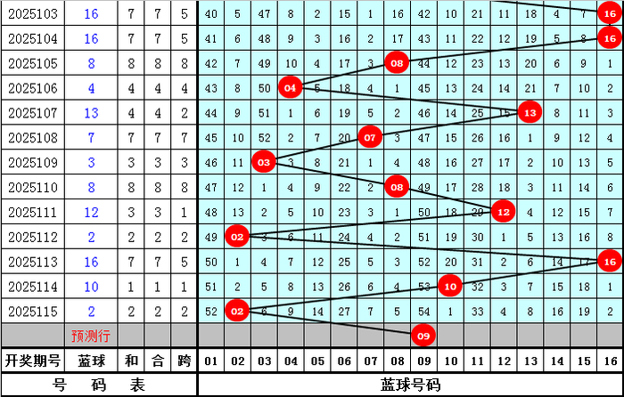 蓝球推荐:第116期历史同期开奖中,蓝球开出频次分别为:04、08出现0次,02、05、06、09、11、12、15、16出现1次,01、07、10、13、14出现2次,03出现3次,今年同期关注蓝球号码09。